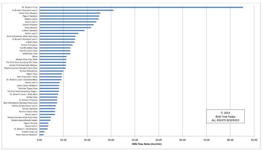 There is no standardized system to rate the flow of nipples. One brand’s “level 1” nipple might have a faster flow than another brand’s “level 3”. Dr. Brown’s level 2 nipple is a slower flow than Enfamil’s preemie nipple! You can check out a comparison chart to see how yours stacks up against others. So long as your baby seems happy and contented during feeding, the nipple size is just fine no matter what number is printed on it. A general rule of thumb is that a feeding should take about 15 minutes, so if you are formula feeding, you may need to go up in nipple size as you start making larger bottles, and if you are feeding breast milk, you may never need to change your nipple size (as your bottles will typically never be larger than four ounces). Editor’s note: Local Colorado IBCLC Cathy Janoka recommends never switching from a size 1 (slow flow) nipple to encourage proper oral development and latch for babies who are also breastfed.